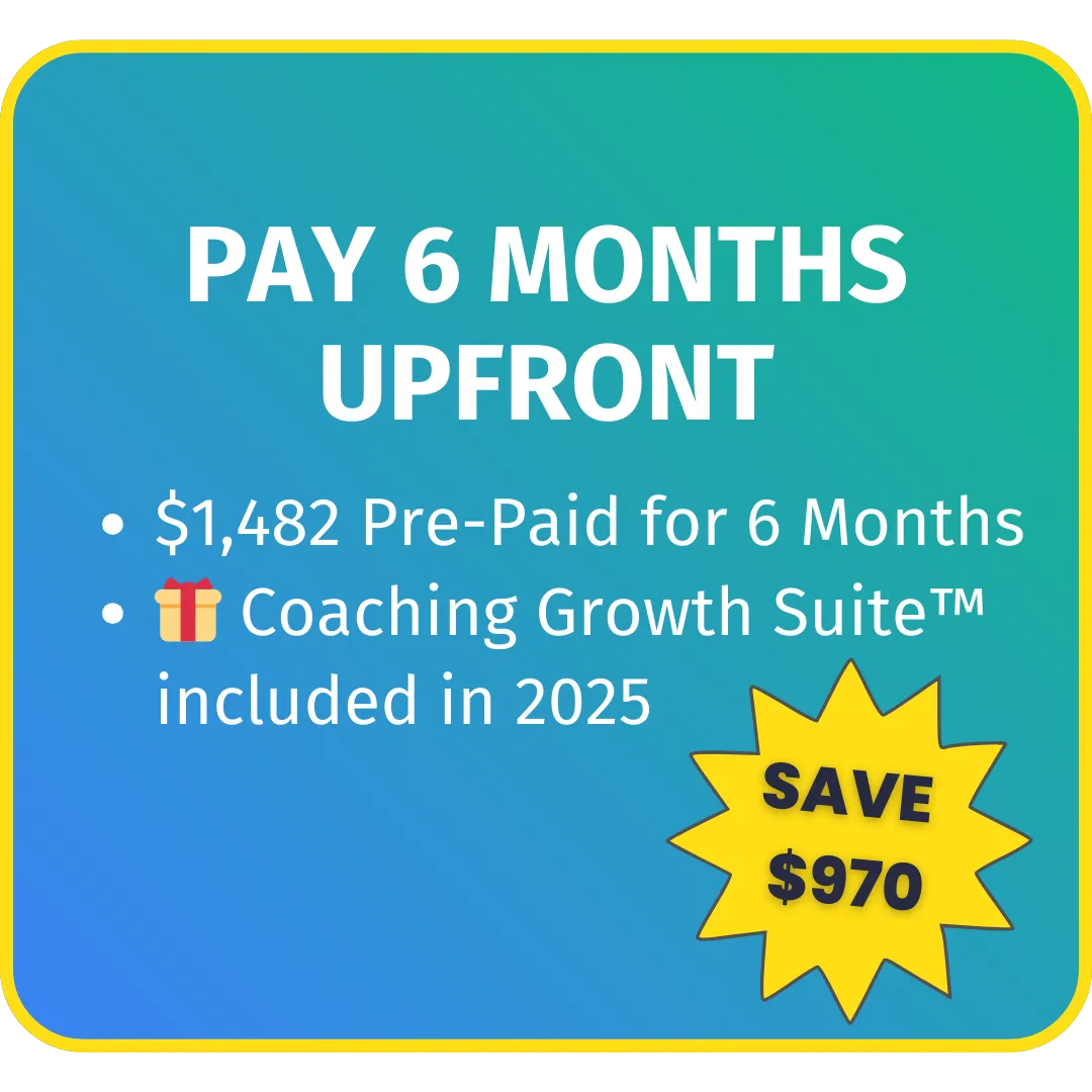 When you choose the 6 month pricing option we will pay for your access to the Coaching Growth Suite™ for the rest of 2025, which provides done-for-you landing pages, funnels, calendars and email automation to help you market your coaching services. This is all the tech you ever need, ready to use, you just need to put in your copy and images. This has a regular price of $97/month.
